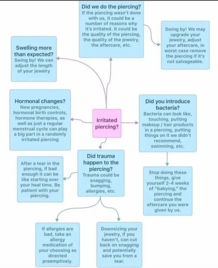 - Consult your aftercare card or contact me to discuss jewelry changing intervals per specific piercings.